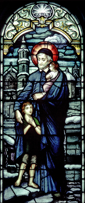 Vincent de Paul, standing, cassock, mantle, skullcap, halo, with two children; winter scene outdoors with snow; courtesy of Fr. Gene Plaisted, OSC