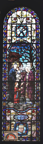 Vincent de Paul, standing, cassock, mantle, skullcap, halo; two children; woman; outdoor scene; St. Benedict's Church, internet image
