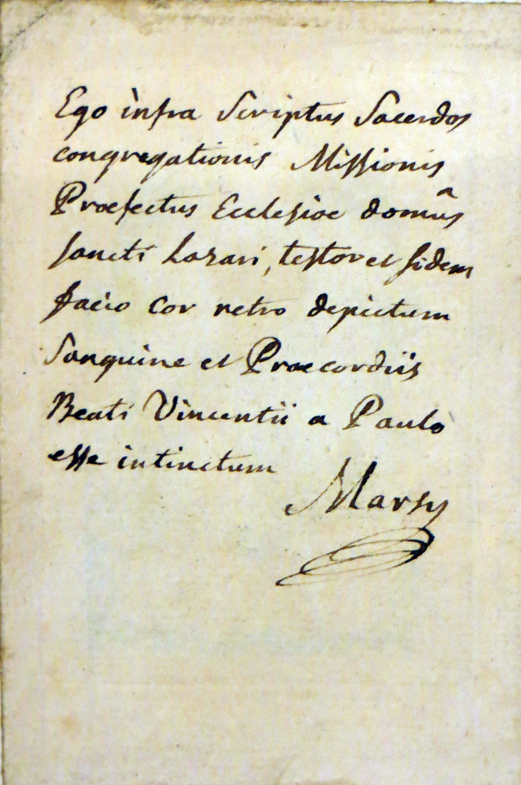 Text: I, the undersigned priest of the Congregation of the Mission, prefect of the church of the house of St. Lazare, testify and assert that the heart depicted on the other side was painted with the blood from the heart of Blessed VdP. [Stanislaus] Marsy