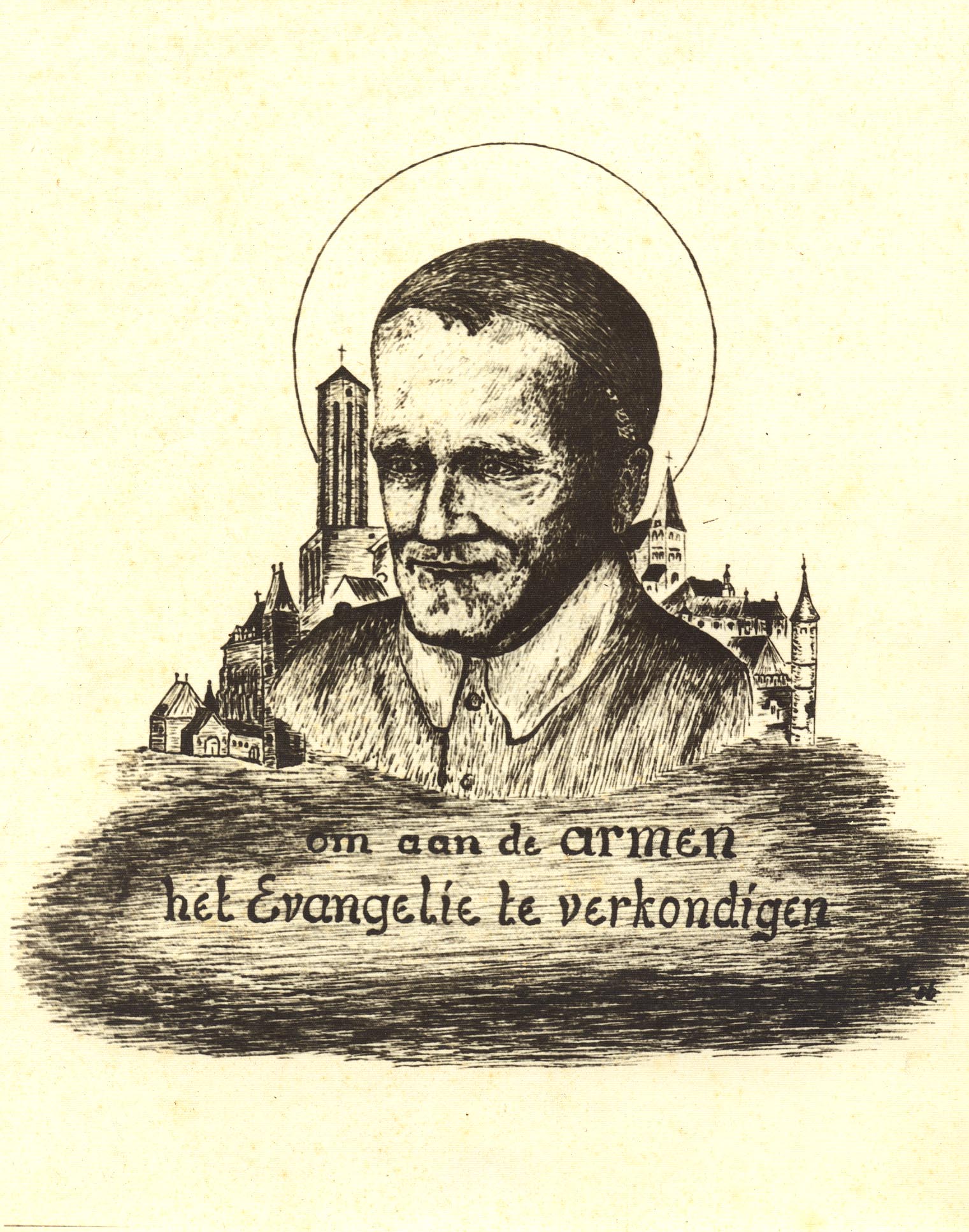 Photograph of pen drawing; Dutch text: "To preach the Gospel to the poor." Background of European buildings. Photo in Vincentian provincial archives, Germantown, Philadelphia