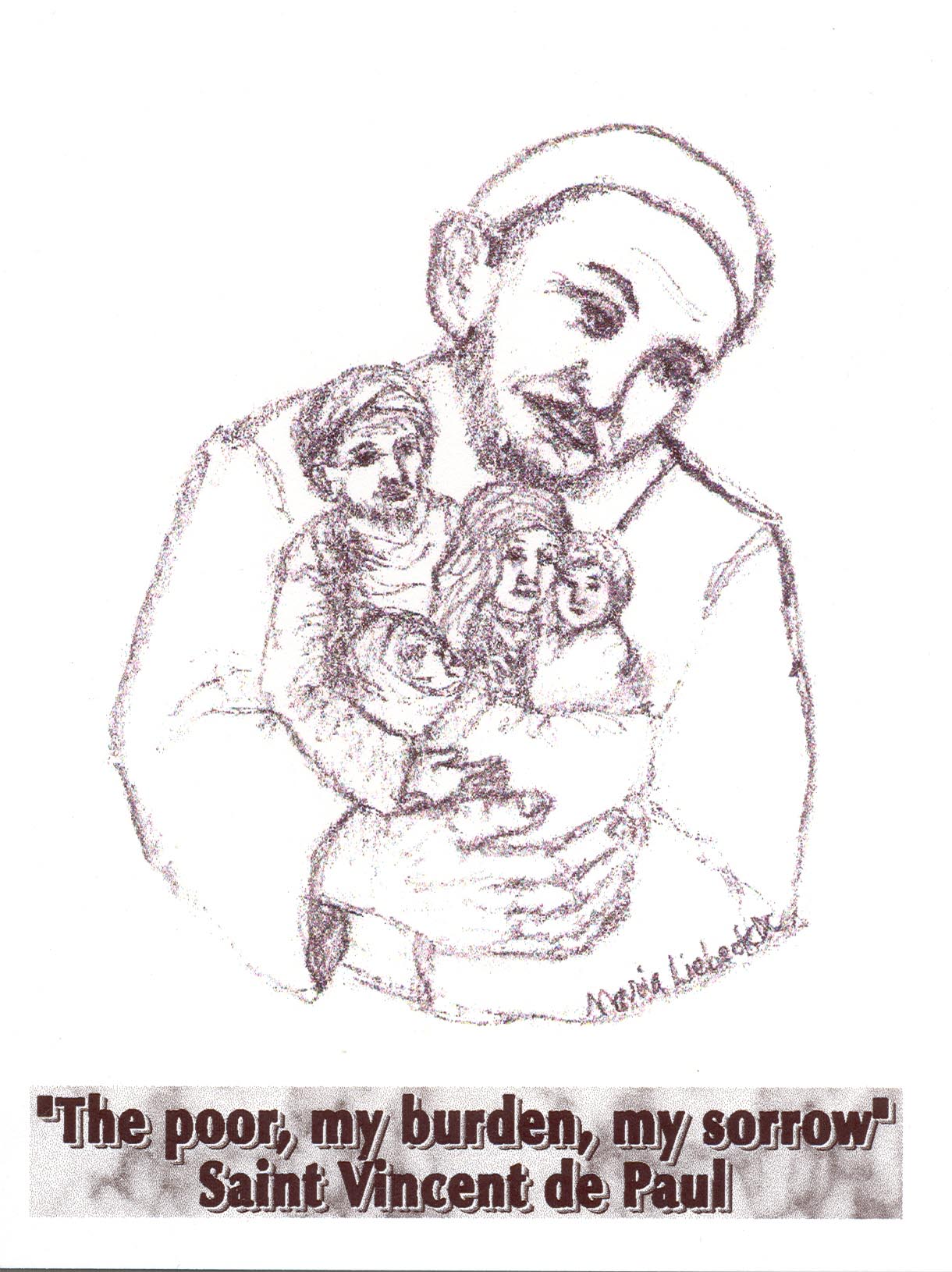 Drawing, Vincent de Paul, sheltering family; English text, based on Abelly's biography; artist, Maria Liebeck, DC