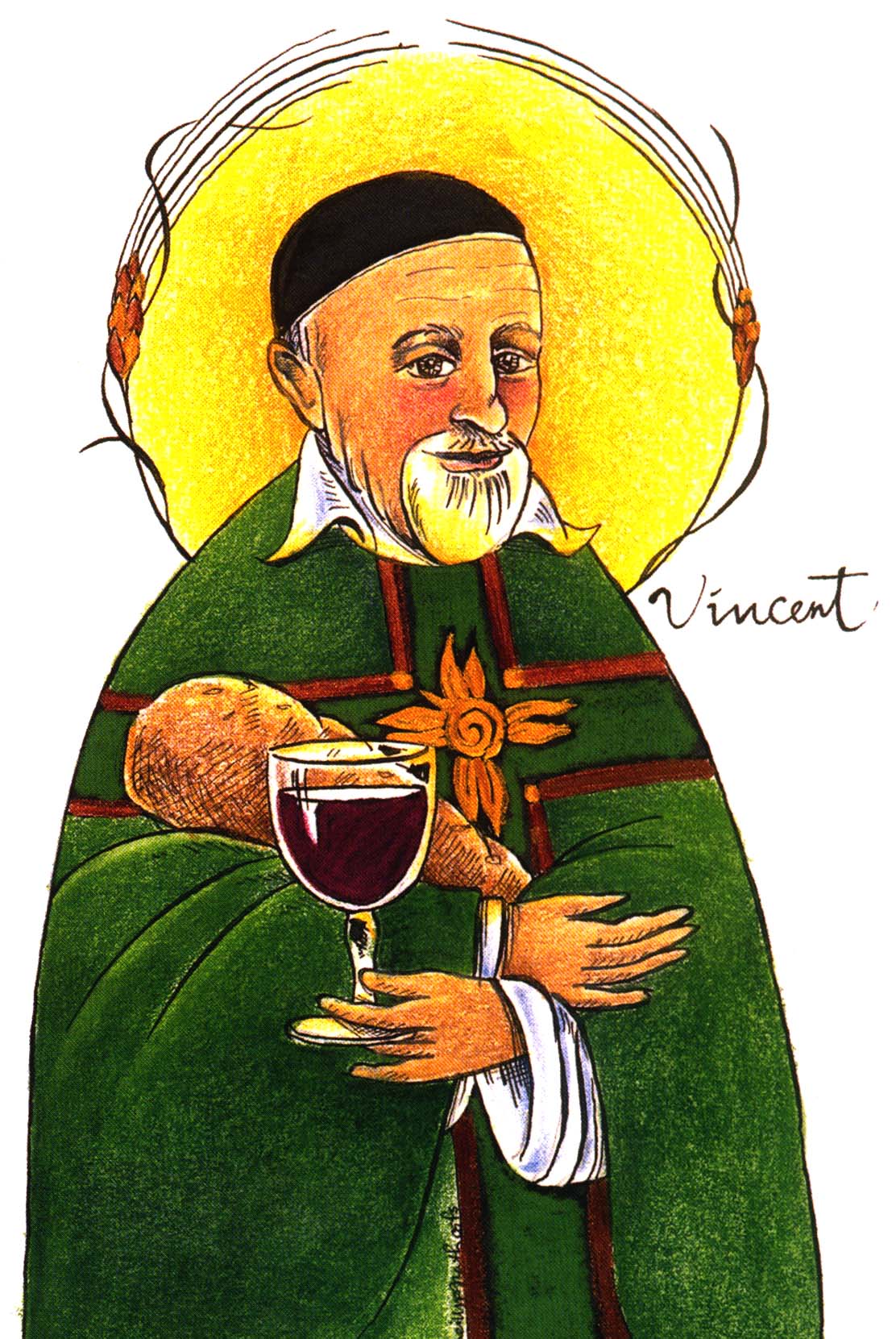 Vincent de Paul in priestly vestments, with bread, wine, halo; may be copyrighted; artist: Michael O'Neill McGrath