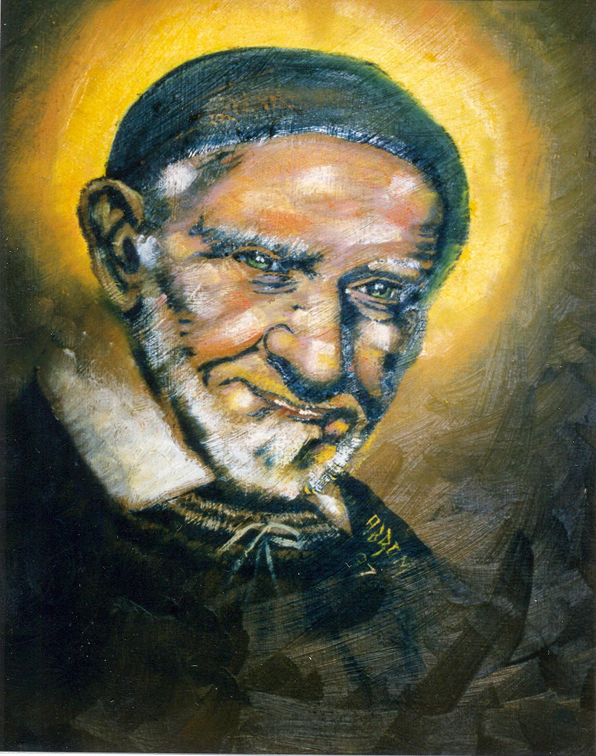Vincent de Paul, cassock, skullcap, yellow halo; signed, dated 1997; original in Bro. Leo Keigher, CM, collection