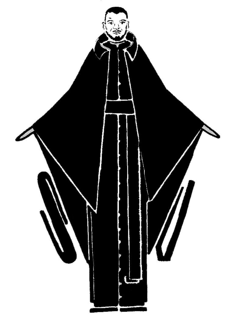 Young Vincent de Paul, standing, cassock, cape, with flanking SV letters; drawn for St. Vincent's College, Cape Girardeau, yearbook, 1966