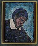 Acrylics and ink over broken pottery, cloth and leather; Vincent de Paul, cassock, skullcap; internet image (Acrylink; maybe copyrighted)