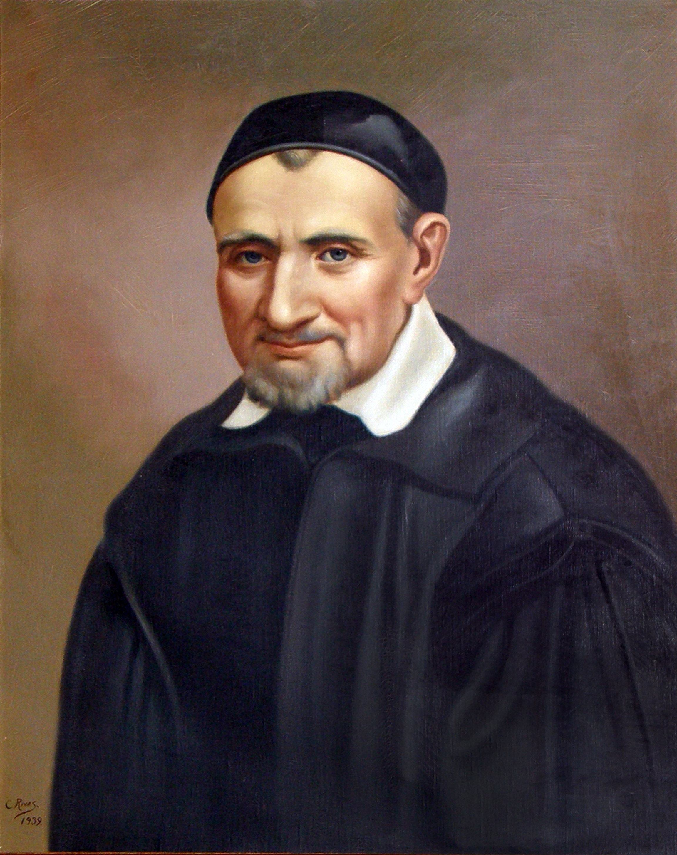 Vincent de Paul, standing, cassock, mantle, skullcap; portrait by C. Rivas, 1939; original at St. John's Seminary, Camarillo, California