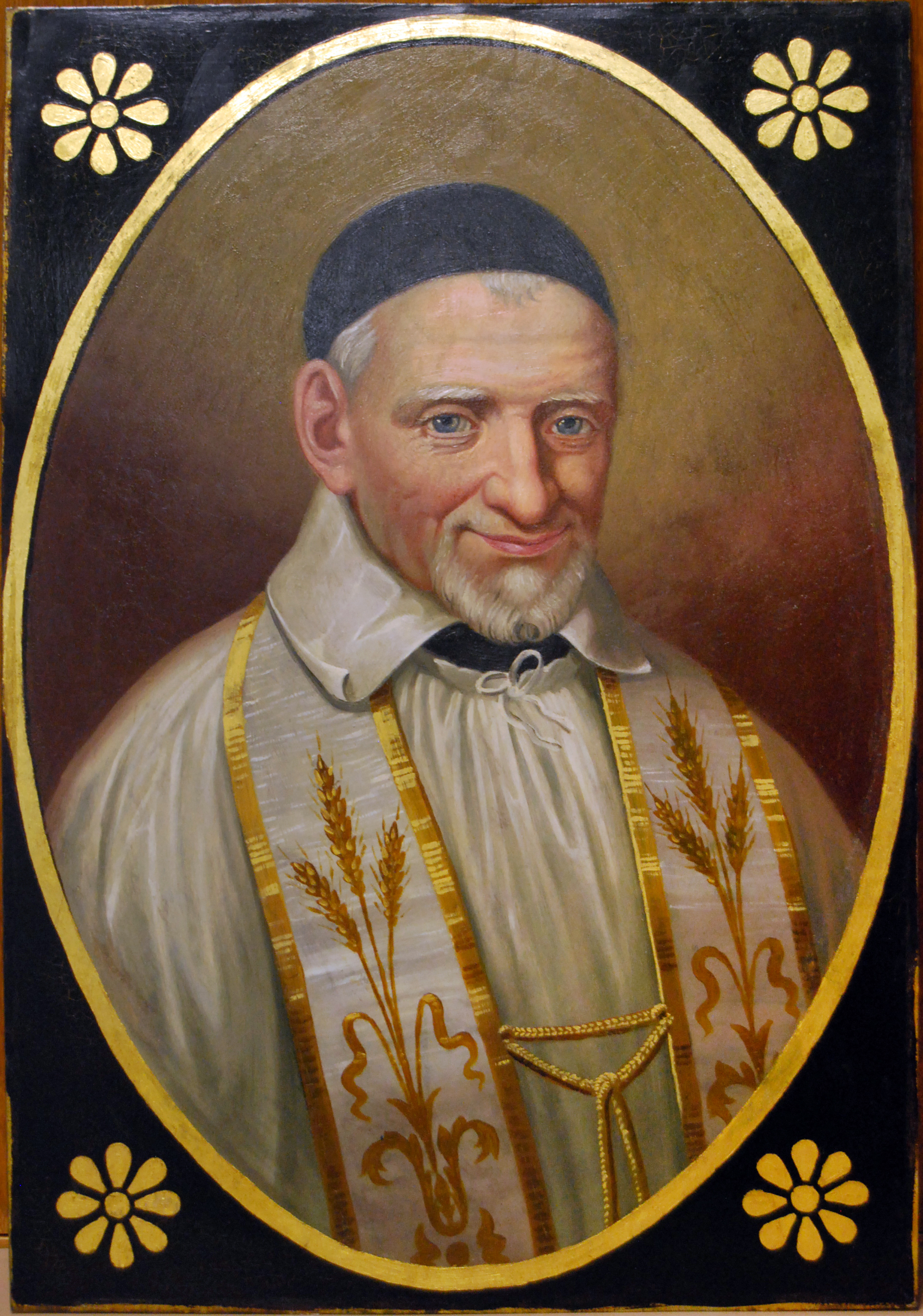 Vincent de Paul, cassock, surplice, white and gold stole, skullcap; oil on tin; artist unknown; original at motherhouse, Emmitsburg, MD; courtesy of Daughters of Charity; permission required for use. Contact ASJPH@doc.org
