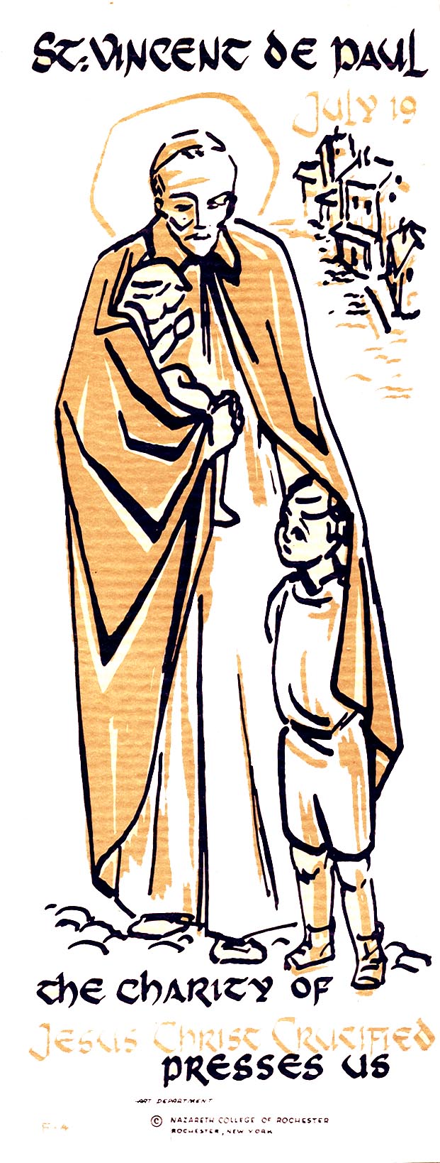 Vincent de Paul, standing, cassock, cape, skulcap, halo, with two children, exterior; July 19 date of original feast day; original in Bro. Leo Keigher, CM, collection; copyright, Nazareth Sisters of Rochester