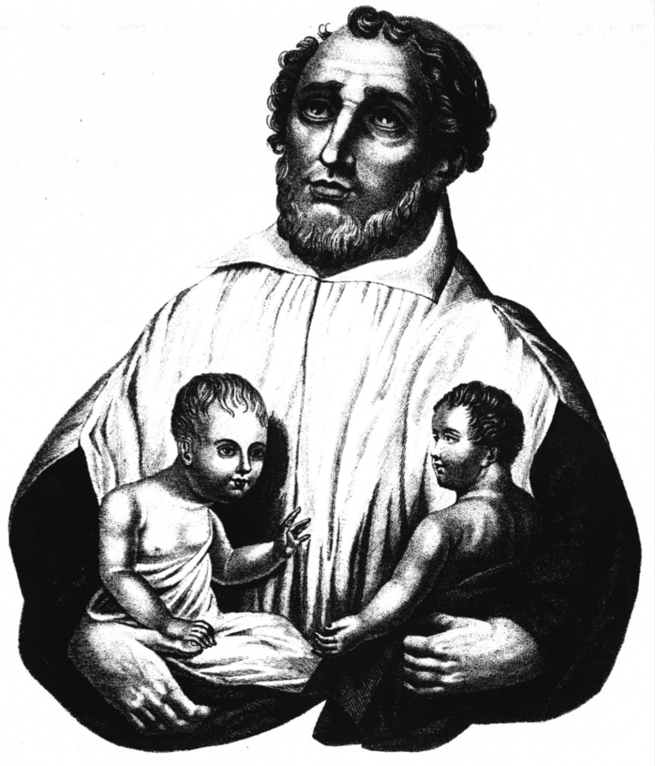 Vincent de Paul, cassock, surplice, curly hair; holding two children in his arms; book illustration (?)