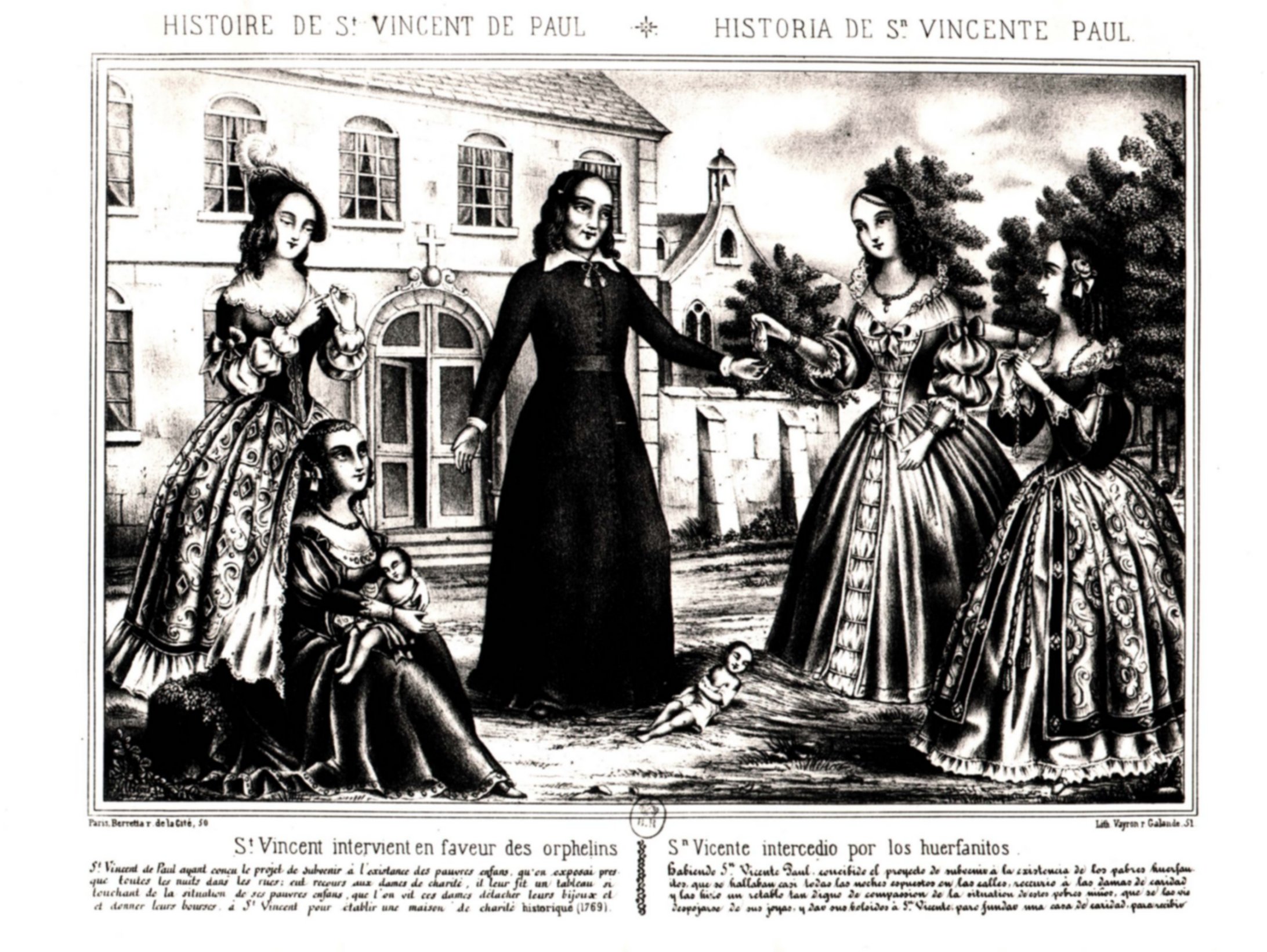 Vincent de Paul, young, standing, cassock, surplice; receiving alms, jewelry, from rich women for foundlings; text in French and Spanish