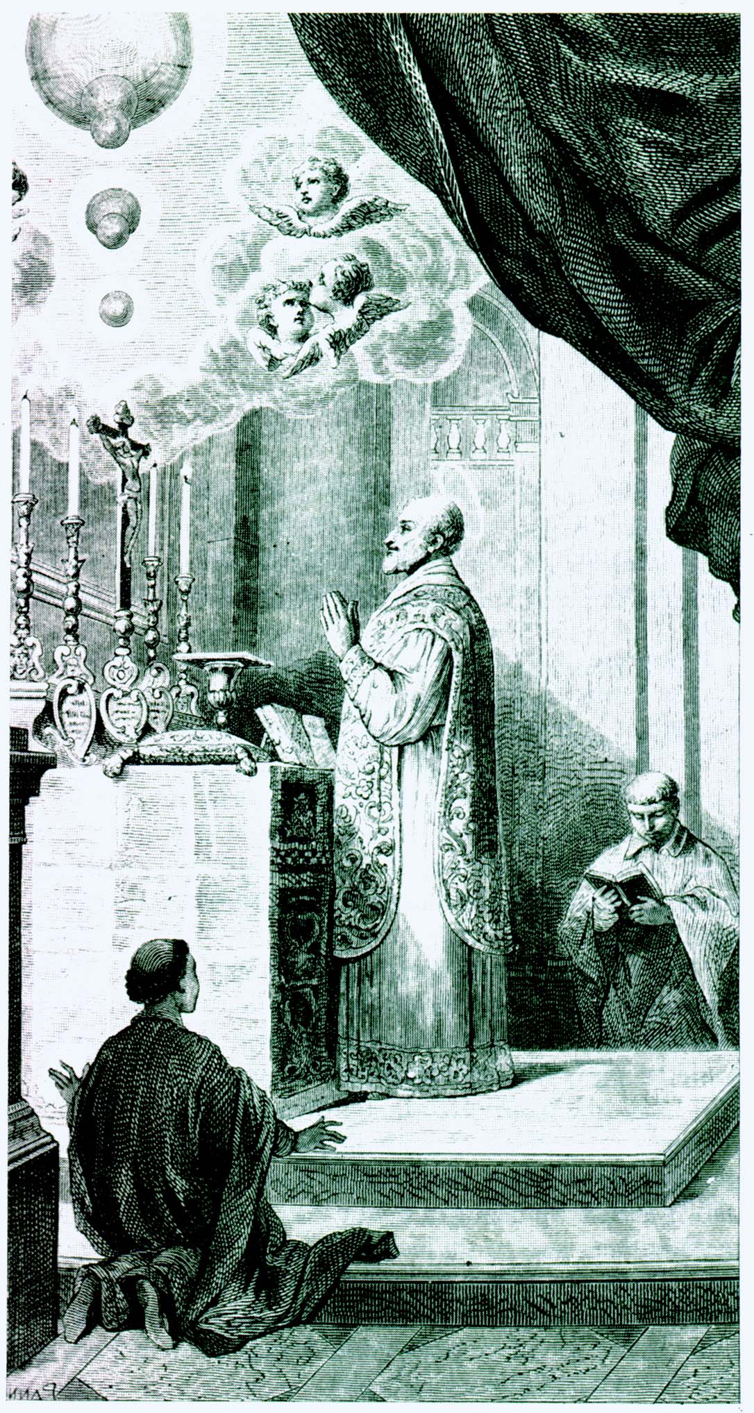 Engraving from canonization series; Vincent de Paul, vested for mass; vision of globes during massPainted version in CM mother house, Paris