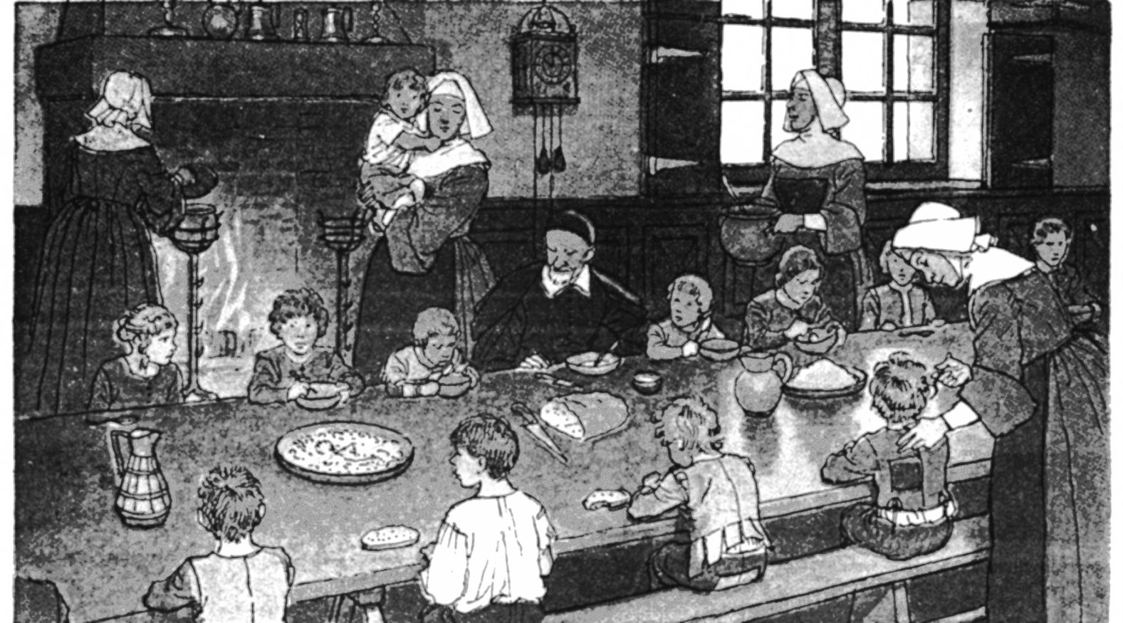 Book illustration (?); Vincent de Paul at table; Daughters of Charity, orphan children