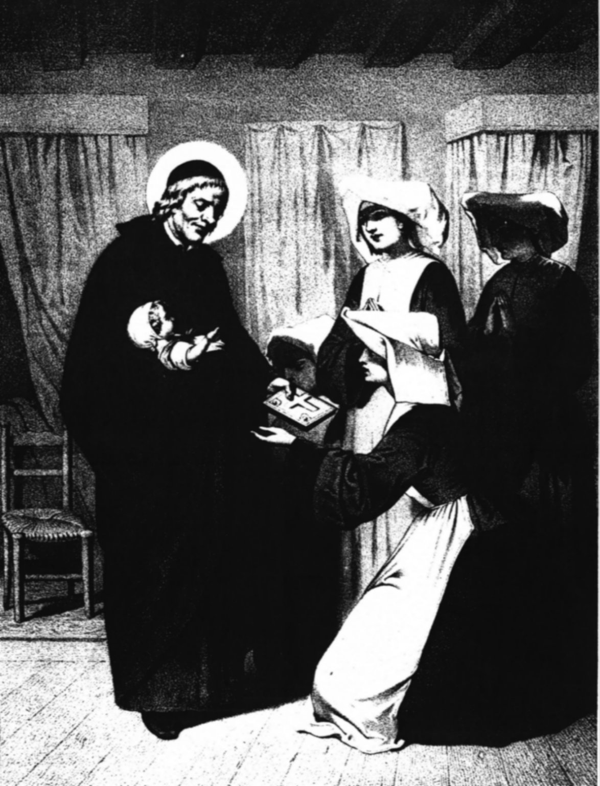 Book illustration (?); Vincent de Paul, standing, cassock, cape, skullcap, halo, holding infant in his arms; offers book (rules?) to Daughters of Charity