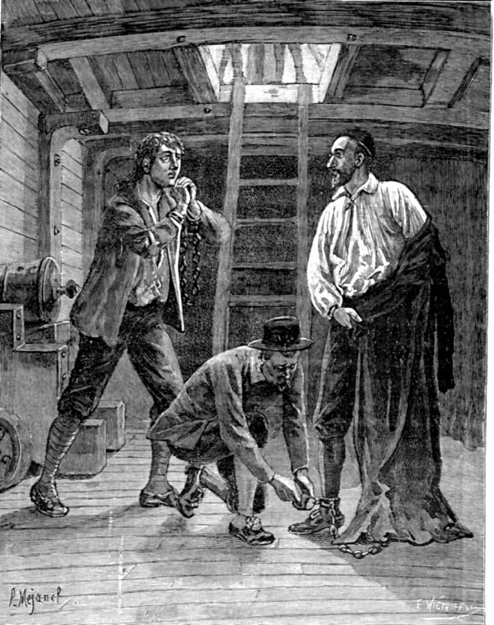 Book or magazine illustration; Vincent de Paul, standing, removing cassock; short pants, shirt, skullcap, taken chains of a captive according to legend