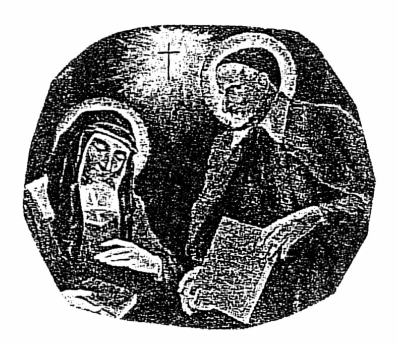 Engraving (?); Vincent de Paul gives rules to Louise de Marillac, both with halos