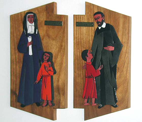 Enamel placques on wood; Vincent de Paul and Louise de Marillac, standing; with children at their side; originals in Daughters of Charity provincial offices, Los Altos Hills, California