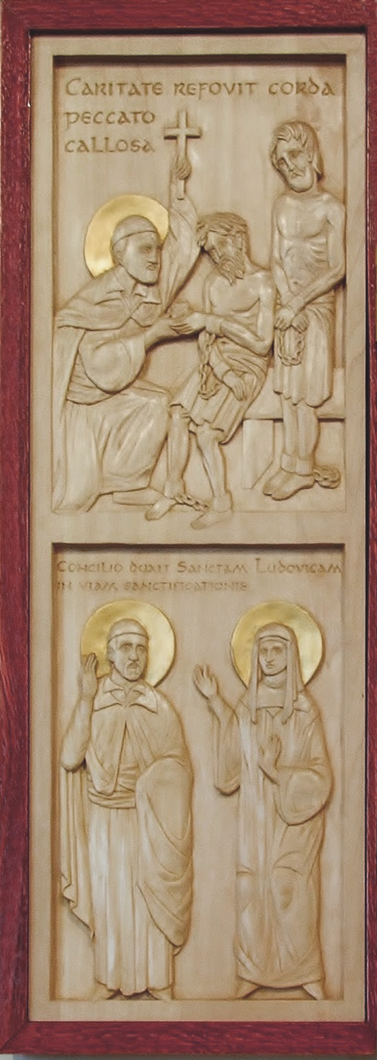 Latin texts: (Above) By charity he warmed hearts stained with sin; (below) By his advice, he gave St. Louise a road to holiness.
