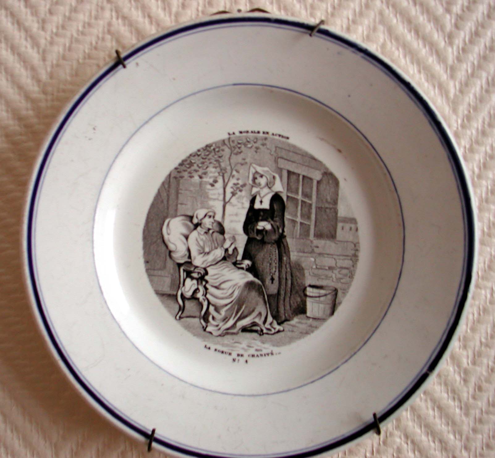 Assiette faience Communauté des Filles de la Charité de LOUVECIENNES. Une Fille de la Charité visite une personne agée. Inscriptions: en haut : "La morale en action",- en bas : "La soeur de charité"