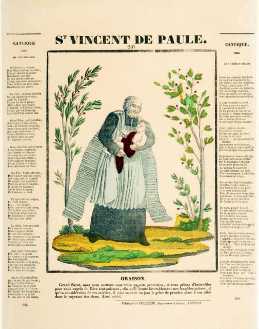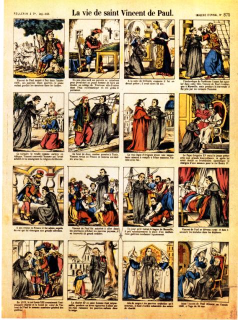 101. France, cartoon 102. France, Vincent de Paul and fellow countrymen 103. France, Vincent de Paul at Clichy, 1929 104. France, Vincent de Paul book cover 105. France, Vincent de Paul boyhood 106. France, Vincent de Paul comics 1981-2 107. France, Vincent de Paul comics 1981-3 108. France, Vincent de Paul comics, 1981-1 109. France, Vincent de Paul comics 110. France, Vincent de Paul in Countryside, 2 111. France, Vincent de Paul rowing galley, cartoon 112. France, Vincent de Paul, Bonne Presse book cover 113. France, Vincent de Paul, book cover 2 114. France, Vincent de Paul, book cover, 1 115. Epinal 1 116. Epinal 1-1, Young Vincent de Paul, shepherd 117. Epinal 1-2, Giving alms 118. Epinal 1-3, Vincent's father sells oxen 119. Epinal 1-4, Taking a ship 120. Epinal 2-1, Captured by pirates 121. Epinal 2-2, sold as a slave in Tunis 122. Epinal 2-3, working for an alchemist 123. Epinal 2-4, his master's wife 124. Epinal 3 125. Epinal 3-1, singing in the fields in Tunis 126. Epinal 3-2, escaping by boat from Tunis 127. Epinal 3-3, Avignon, reconciling his master 128. Epinal 3-4, Mr. de Rougemont 129. Epinal 4 130. Epinal 4-1, Mr. de Rougemont and bad dreams 131. Epinal 4-2, at prayer 132. Epinal 4-3, writing letters 133. Epinal 4-4, reading 134. Epinal 5 135. Epinal 5-1, Judge of Sore accuses Vincent of theft 136. Epinal 5-2, Vincent imprisoned 137. Epinal 5-3, tutor of Gondi children 138. Epinal 5-4, at deathbed of Louis XIII 139. Epinal 6 140. Epinal 6-1, intercedes with the king 141. Epinal 6-2, Folleville castle 142. Epinal 6-3, Ladies of Charity 143. Epinal 6-4, Mme. de Gondi 144. Epinal 7 145. Epinal 7-1, entering church 146. Epinal 7-2, Daughter of Charity and sick man 147. Epinal 7-3, receiving a document 148. Epinal 7-4, taking chains of a prisoner 149. Epinal 8 150. Epinal 8-1, gathering foundlings by night 151. Epinal 8-2, Vincent de Paul dying 152. Epinal 8-3, Saint Vincent de Paul 153. Epinal 875, 01 154. Epinal 875, 02 155. Epinal 875, 03 156. Epinal 875, 04 157. Epinal 875, 05 158. Epinal 875, 06 159. Epinal 875, 07 160. Epinal 875, 08 161. Epinal 875, 09 162. Epinal 875, 10 163. Epinal 875, 11 164. Epinal 875, 12 165. Epinal 875, 13 166. Epinal 875, 14 167. Epinal 875, 15 168. Epinal 875, 16 169. Epinal 875, complete 170. Epinal, foundlings, 1 171. Epinal, foundlings, 2 172. Epinal, foundlings, 3 173. Epinal, foundlings, 4 174. Epinal, foundlings, 5 175. Epinal, foundlings, complete 176. Epinal, Vincent de Paul holding child 177. Epinal, Vincent de Paul with foundlings, Sisters 178. France, Vincent de Paul, child, hymn 180. Fr-Sp, Vincent de Paul and Death of Louis XIII, color, text 181. Fr-Sp, Vincent de Paul and Death of Louis XIII, color 182. Fr-Sp, Vincent de Paul and death of Louis XIII, no color 183. Fr-Sp, Vincent de Paul takes chains of galley prisoner 184. Fr-Sp, Vincent de Paul with foundlings, color, text 185. Fr-Sp, Vincent de Paul with foundlings, color 186. Fr-Sp, Vincent de Paul with foundlings, no color 187. Fr-Sp, Vincent de Paul, first Mass, color 188. Fr-Sp, Vincent de Paul, first Mass, color, detail 189. Fuka, Vincent de Paul at palace 190. Fuka, Vincent de Paul distributing soup 191. Fuka, Vincent de Paul gathering foundling 192. Fuka, Vincent de Paul head 193. Fuka, Vincent de Paul ringing village bell for mission 194. Fuka, Vincent de Paul with poor 195. Lochon, Vincent de Paul, in Abelly 195a, Lochon, with quatrain 196. French 197, French card 198. Blessed VdP 199. Debrie 1738 200. France