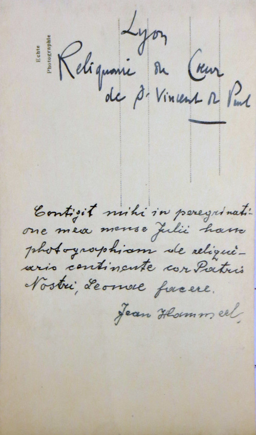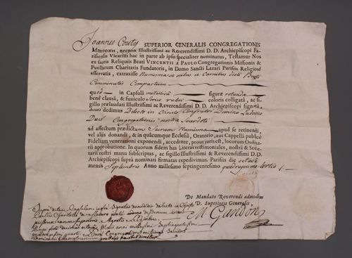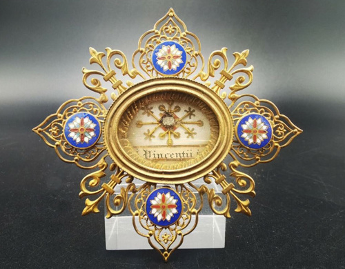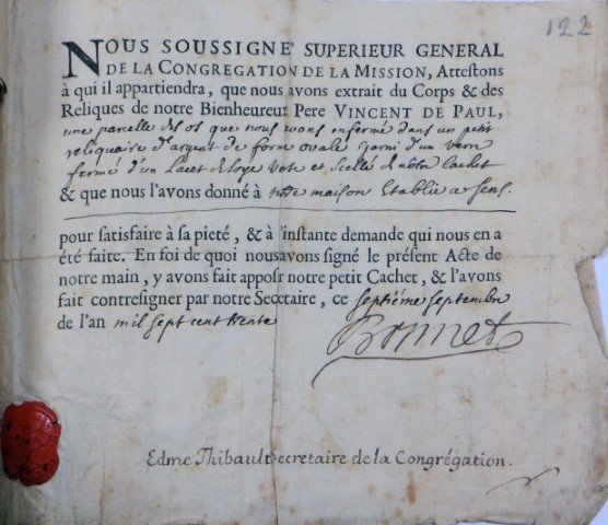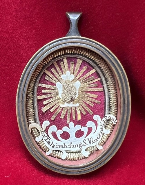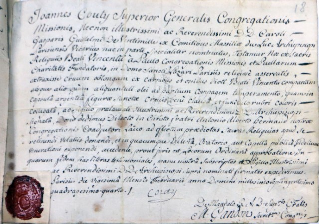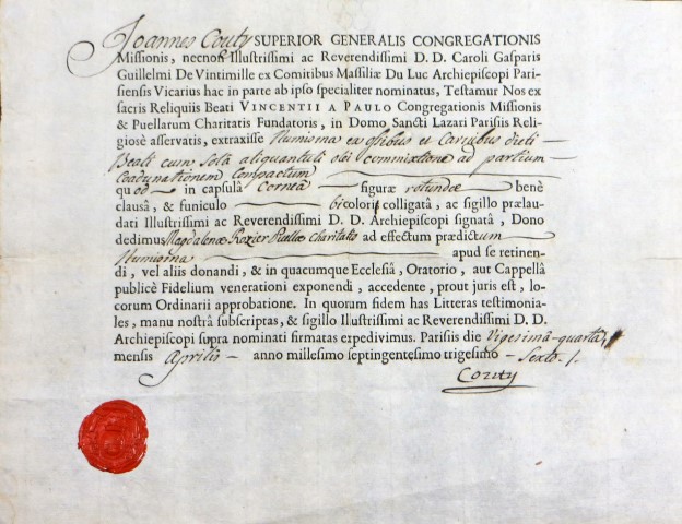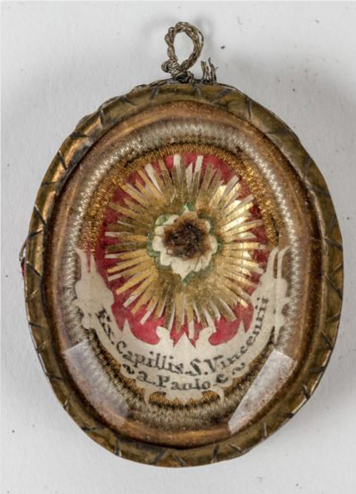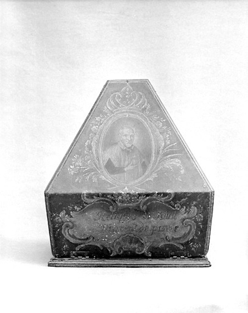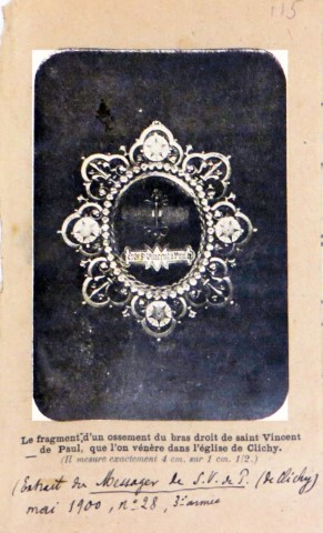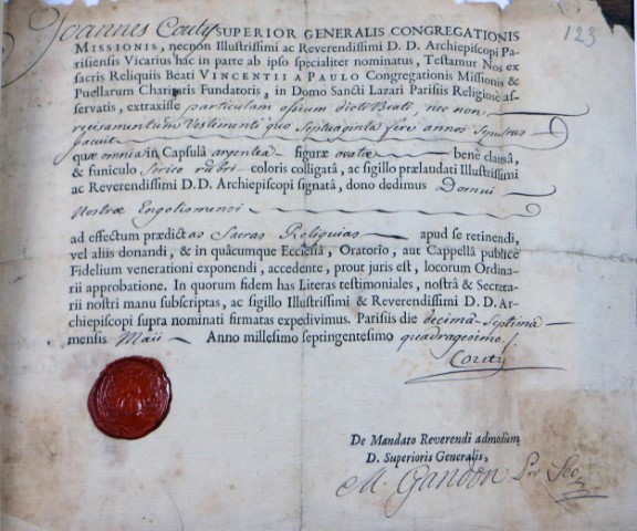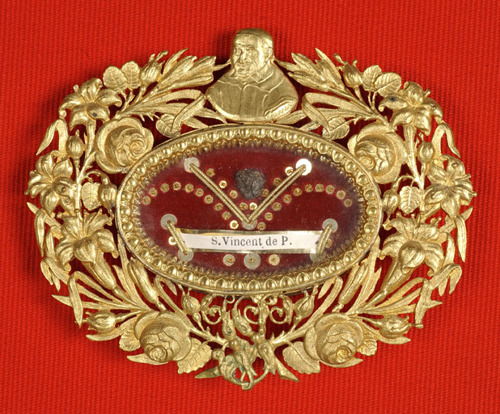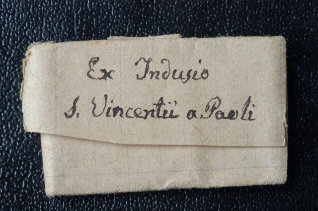 000 Introduction Belgium, reliquary, with wax medallion 1 Belgium, reliquary, with wax medallion 2 China, Hong Kong 1 China, Hong Kong 2 France, (probably) reliquary 50, clothing France, Ambrugeat (Corrèze) France, Berceau, bandages for Vincent's legs France, Berceau, Cross of Our R[everend] F[ather] Vincent de Paul France, Berceau, fragments of burial clothing 1660 France, Berceau, linen bed sheet of SVdP, identification France, Berceau, linen bed sheet of SVdP, laundry marks France, Berceau, linen bed sheet of SVdP France, Berceau, St. Vincent's chair from Buzet 1 France, Berceau, St. Vincent's chair from Buzet 2 France, Berceau, St. Vincent's chair from Buzet 3 France, Berceau, SV chair plaque France, Berceau, SV chair sign 1 France, Berceau, SV chair sign 2 France, Berceau, SV penitential belt fragment France, Berceau, SV shoe 1 France, Berceau, SV shoe 2 France, Berceau, SV shoe 3 France, Berceau, SV shoe 4 France, Berceau, SV shoe 5 France, Berceau, SV shoe 7 France, Berceau, SV shoe, 6 France, Berceau, SV stole France, Bonchamp les Laval (Mayenne) France, Clichy, crucifix 1 France, Clichy, crucifix 2 France, Clichy, relic in glass holder France, Clichy, relic of right arm France, Dourdan, hospital France, Fontenay-le-Comte, hospital France, Ivry-sur-Seine (Val de Marne). hospital France, Jura, monstrance reliquary, monstrance France, Lyons, cathedral treasury France, Lyons, cathedral, heart reliquary France, Lyons, cathedral, photographer of heart relic France, Lyons, cathedral, relic veneration 1805 France, Lyons, cathedral, reliquary France, Lyons, cathedral, Vestments display France, Lyons, cathedral, vestments France, Melun (Seine-et-Marne), N-D, cross of SV fragment, et al France, Montmirail, church, relic SV France, Montmirail, church, reliquary France, Montmirail, SV pulpit France, Moutiers St Jean, pharmacy-1 France, Moutiers St Jean, pharmacy-2 France, Paris, Assistance Publique, Antiphonary, chasuble France, Paris, book to hold heart relic France, Paris, DC motherhouse France, Paris, holy card of heart, back France, Paris, holy card of heart, front France, Paris, La Madeleine, reliquary of VdP France, Paris, mother house, confessional France, Paris, Notre Dame France, Paris, relic certificate, Bonnet, 23 July 1731 France, Paris, relic certificate, Bonnet, 7 Sept 1730 France, Paris, relic certificate, Couty, 17 May 1740 France, Paris, relic certificate, Couty, 20 February 1744 France, Paris, relic certificate, Couty, 24 April 1736 France, Paris, relic certificate, Debras, 20 June 1758 France, Paris, rue du Bac, heart reliquary France, Paris, rue du Bac, heart reliquary France, Paris, Salpetriere 1 France, Paris, Salpetriere 2 France, Paris, Salpetriere 3 France, Paris, St. Genevieve chasuble France, Paris, SV alb, used after death France, Paris, SV Altar 1815 France, Paris, SV book stand, mother house France, Paris, SV Breviary title page, Winter France, Paris, SV Breviary, title page, Summer France, Paris, SV breviary, with holy card France, Paris, SV candlestick France, Paris, SV cassock 1 France, Paris, SV cassock 2 France, Paris, SV cassock 3 France, Paris, SV cassock 4 France, Paris, SV cassock 5 France, Paris, SV cassock 6 France, Paris, SV cassock 7, neckband France, Paris, SV cassock, 8, showing hem France, Paris, SV hairshirt 1 France, Paris, SV hairshirt 2 France, Paris, SV house shoe 1 France, Paris, SV house shoe 2 France, Paris, SV house shoe 3 France, Paris, SV house shoe 4 France, Paris, SV house shoe 5 France, Paris, SV house shoe 6 France, Paris, SV house shoe 7 France, Paris, SV Intestinal stone France, Paris, SV knife and case France, Paris, SV knife case France, Paris, SV Linen bandages France, Paris, SV penitential belt France, Paris, SV penitential belt France, Paris, SV rosary, 6 decades France, Paris, SV seals France, Paris, SV stole, silver 1 France, Paris, SV umbrella France, Paris, SV vial of dried blood 1 France, Paris, SV vial of dried blood 2 France, Paris, SV vial of dried blood 3 France, Paris, SV vial of dried blood, close-up France, Paris, SV vials of dried blood held by angels France, Paris, SV wax medallion, detail France, Paris, SV wax medallion France, Paris, SV, piece of clothing France, Paris, SVdP, book stand 1 France, Paris, SVdP, book stand 2 France, Paris, telegram 1907 France, Paris, visible tonsure, 19th century France, Pouy, relic certificate, 1743 France, Pouy, reliquary France, reliquary 01, case closed France, reliquary 02, case, Mirac. Medal, obv France, reliquary 03, case, Mirac. Medal, rev France, reliquary 04, case, opened France, reliquary 05, case, SVdP and other saints France, reliquary 06, case, with Miraculous Medal France, reliquary 07, with Miraculous Medal on case France, reliquary 08, hair shirt France, reliquary 09, black cloth France, reliquary 10, blood, silver frame France, reliquary 11, hair 1 France, reliquary 12, hair 2.jpg France, reliquary 13, white cloth, wood frame France, reliquary 14, red cloth France, reliquary 15, repoussé portrait France, reliquary 16, perhaps blood France, reliquary 17, cloth in a glass tube France, reliquary 18, multiple relics including VdP France, reliquary 19, statuette in coffin-shaped container; relic on cover (not shown) France, reliquary 20, cloth France, reliquary 21, cloth; enamel decorations France, reliquary 22, multiple, obv France, reliquary 23, multiple, rev France, reliquary 24, Thibouville France, reliquary 25 France, reliquary 26 France, reliquary 27 France, reliquary 28 France, reliquary 29 France, reliquary 30, fleur-de-lys France, reliquary 31, with seal, attestation France, reliquary 32, hair France, reliquary 33, cover France, reliquary 34, clothing France, reliquary 35, bone France, reliquary 36, black cloth France, reliquary 37, 18th century France, reliquary 38 France, reliquary 39 France, reliquary 40, see 39, black fabric, silver case (theca) France, reliquary 41, with box France, reliquary 42 France, reliquary 43, framed France, reliquary 44 Fran