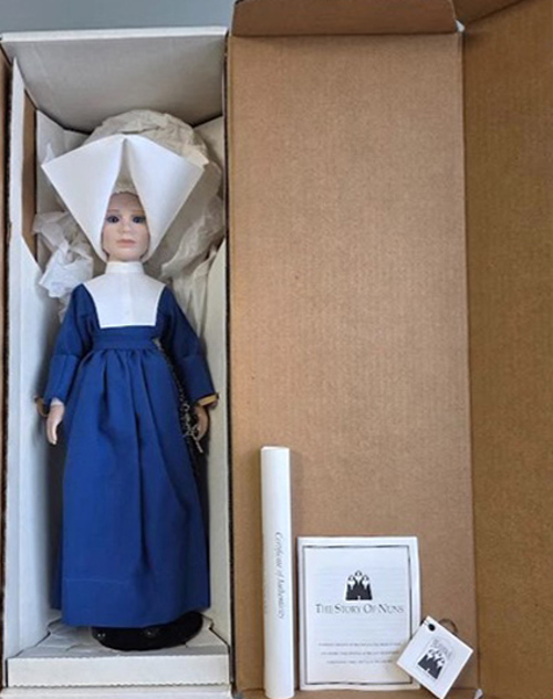 Figurine, American habit 1 Figurine, American habit 2 Figurine, bronze, Sister nursing a sick man Figurine, bronze, teaching reading Figurine, bust Figurine, buxom Sister Figurine, Doll, clothed 01 Figurine, Doll, clothed 02 Figurine, Doll, clothed 03 Figurine, Doll, clothed 04 Figurine, Doll, clothed 05 Figurine, Doll, clothed 06 Figurine, Doll, clothed 07 Figurine, Doll, clothed 08 Figurine, Doll, clothed 09, new habit Figurine, Doll, clothed 10, porcelain head, blue habit Figurine, Doll, clothed 11 Figurine, Doll, clothed 12, porcelain head, rosary FIgurine, Doll, clothed 13 Figurine, Doll, clothed 14 Figurine, Doll, clothed 15 Figurine, Doll, clothed 16, with basket Figurine, Doll, clothed 17 Figurine, Doll, clothed 18 Figurine, Doll, clothed 19 Figurine, Doll, clothed 20 Figurine, Doll, clothed 21 Figurine, Doll, clothed 22, Paris Figurine, England, Royal Worcester porcelain, candle snuffer Figurine, head with large coif Figurine, kneeling sister, purple habit Figurine, orange Sister Figurine, porcelain, on a table Figurine, pottery Figurine, Singer, playing guitar Figurine, Singer, with book Figurine, Sister holding a child Figurine, Sister with candelabra, doll Figurine, Tabacco jar back Figurine, Tabacco jar, front Figurine, Three Sisters singing Figurine, two Sisters singing 1 Figurine, Two Sisters singing 2 Figurines, identified as tobacco container Figurines, Sisters in black habit and cornette Figurines, Three sisters bowling Figurines, three sisters, by Dave Grossman Figurines, three views Figurines, Two Sisters, black habits France, Angers, Statue 02, Sister Elderly woman, in garden France, Daughter of Charity, bronze statuette France, Montolieu, tea pot front France, Montolieu, tea pot, rear France, nursing a wounded soldier France, Sister, bronze plaque France, teapot 01 France, teapot 02, alternate decoration France, teapot 03 France, teapot 04 Frieze, statuary group Italy, by Lenci, Turin 1 Italy, by Lenci, Turin 2 Italy, by Lenci, Turin 3 Italy, by Lenci, Turin 4, three pairs Italy, Capodimonte, with book Italy, clothed Sister doll Japan, baseball 1 Japan, baseball 2 Japan, Kreiss 1 Japan, Kreiss 2, two figures Japan, Kreiss 3, Wee Little Sisters Japan, Kreiss 4, 1957 Japan, three figures Plaque, commemorating centy of Sisters, 1847-1947 in Brixen (perhaps) Plaque, France, Boussois, parish church, St. Martin, detail of the shining cross Sister 01, bronze Sister 02, bronze bust; Sister 03, bronze group, with children Sister 04, Kneeling in prayer (see USA Chicago) Sister 05, bronze Sister 06, bronze Sister 07, painted porcelain Sister 08, dressed doll Sister 09, with two children Sister 10, bronze Sister 11, bronze Sister 12, bronze Sister 13, bronze, see 12 Sister 14, Gale force Sister 15, bronze Sister 16, clothed doll Sister 17, with children at play Spain, Algora bisque figurine 01 Spain, Algora bisque figurine 02 Spain, Lladro 01 Spain, Lladro 02, morning chores Spain, Lladro 03, embroidering Spain, Lladro 04a, embroidering Spain, Lladro 04b Spain, Lladro 05, bell ringer Spain, Lladro 06 Spain, Lladro 07 Spain, Lladro 08a Spain, Lladro 08b Spain, Lladro 09, detail Spain, Lladro 10, two Sisters Spain, Lladro 11, two Sisters Spain, Lladro 12, two Sisters Spain, Lladro 13, four Sisters Spain, Lladro 14, with girl Spain, Lladro 15, seated Spain, Spanish habit, statue Spain, three Sisters Statue 01 Statue 02 UK, Bronze, by Philip Jackson, Guided Missal UK, Gale Force Nun I, Philip Jackson UK, Gale Force nun II, by Philip Jackson UK, Gale Force Nun III, Philip Jackson USA, CA, Los Altos Hills, Daughters in action USA, CA, Los Altos Hills, Daughters in community USA, CA, Los Altos Hills, Daughters in prayer USA, CA, Los Altos Hills, Daughters in recreation USA, CA, Los Altos Hills, Sister carrying suitcases USA, CA, Los Altos Hills, Sister walking USA, clothed doll 01 USA, clothed doll 02 USA, Clothed doll 03, dyed corn husks USA, clothed doll 04 USA, Clothed doll 05 USA, IL, Chicago, Sister kneeling at prayer, with begging bag USA, IL, Chicago, Sister with cross USA, Medallion, 1633-1983 (2) USA, PA, Gettysburg, St. Francis church USA, two children with Sister